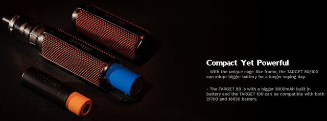 Vaporesso Target 100 Kit is a small size and with exquisite apperance. It is also simple to operate and all the vaping details. 0.96'' OLED display shows you vape detail. is the first to use water-resistant braid fabrics to make Target 100 more durable for outdoor use and comfortable to hold. 5 colors for you to choose from.